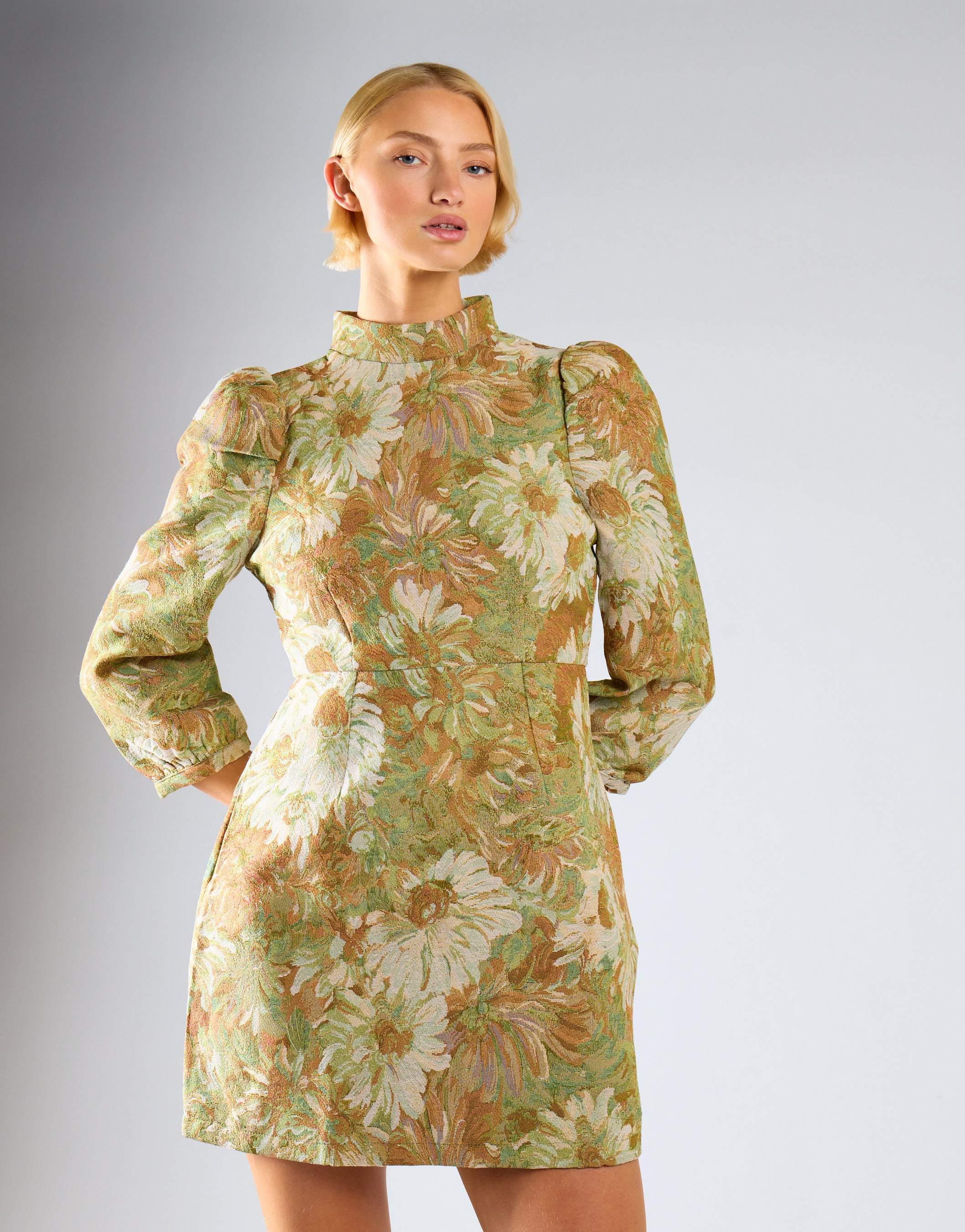 Green Multi Brocade High Neck Puff Shoulder Mini Dress