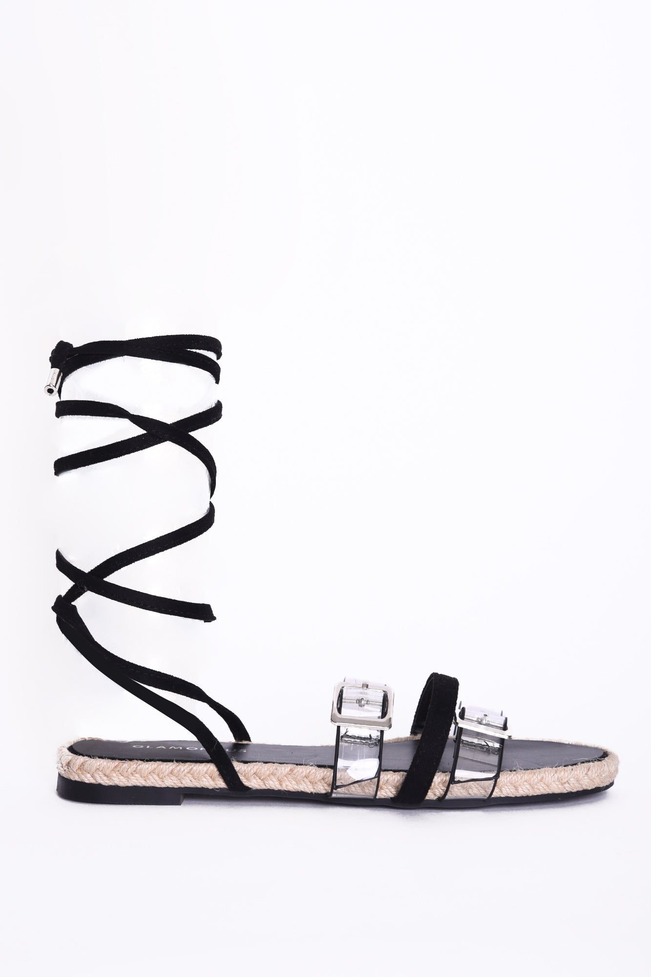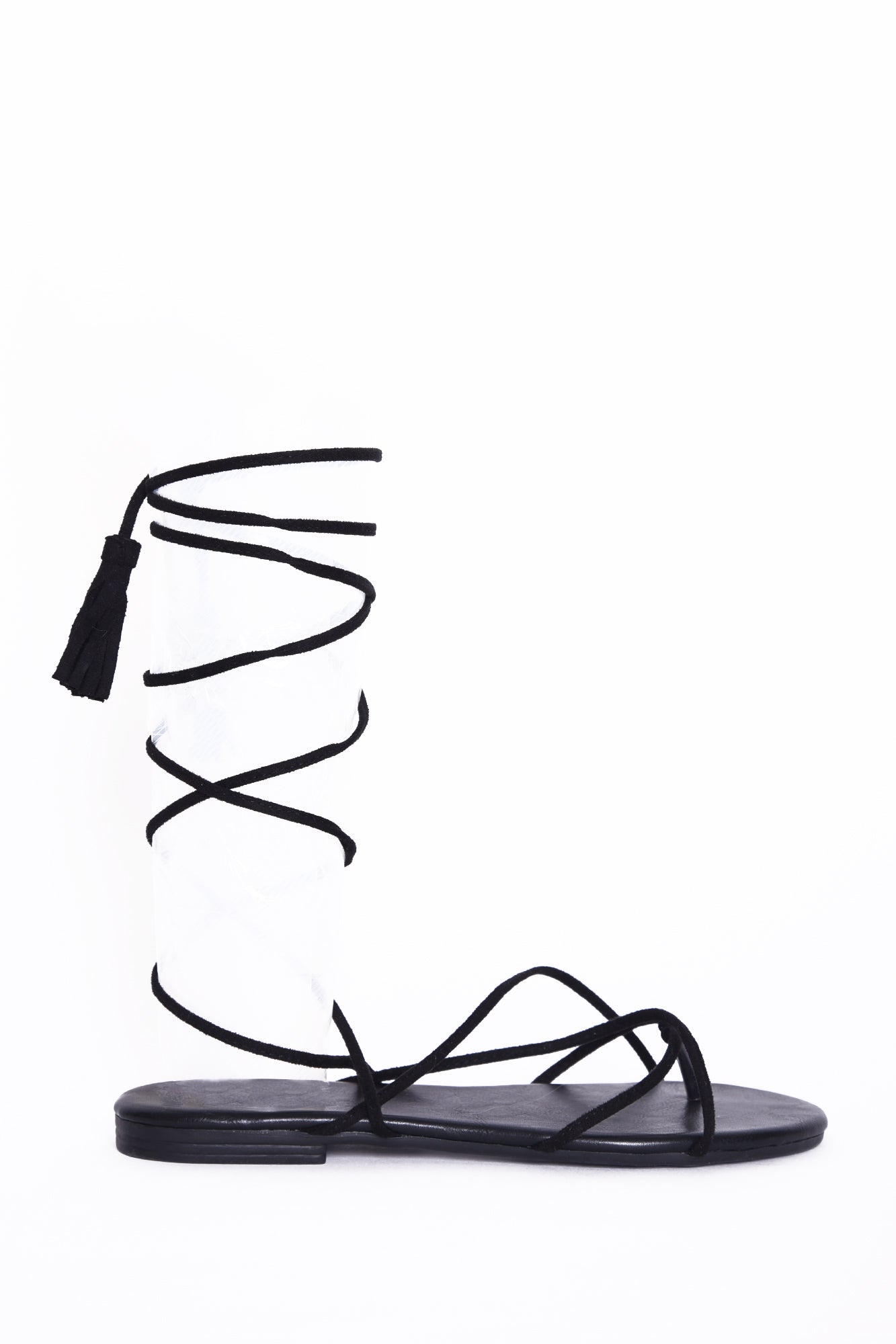 Glamorous Black Lace Up Clear Buckle Strap Sandals