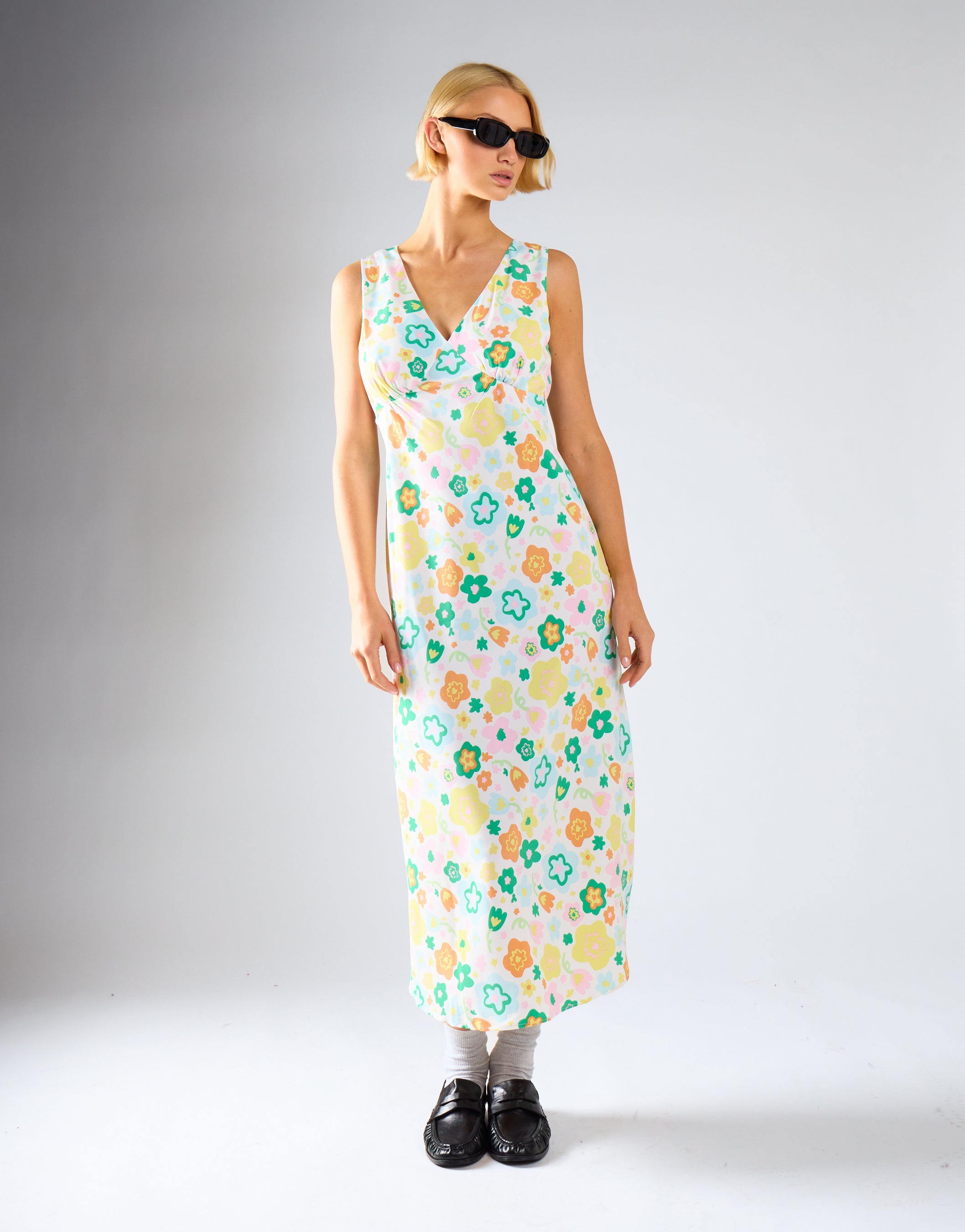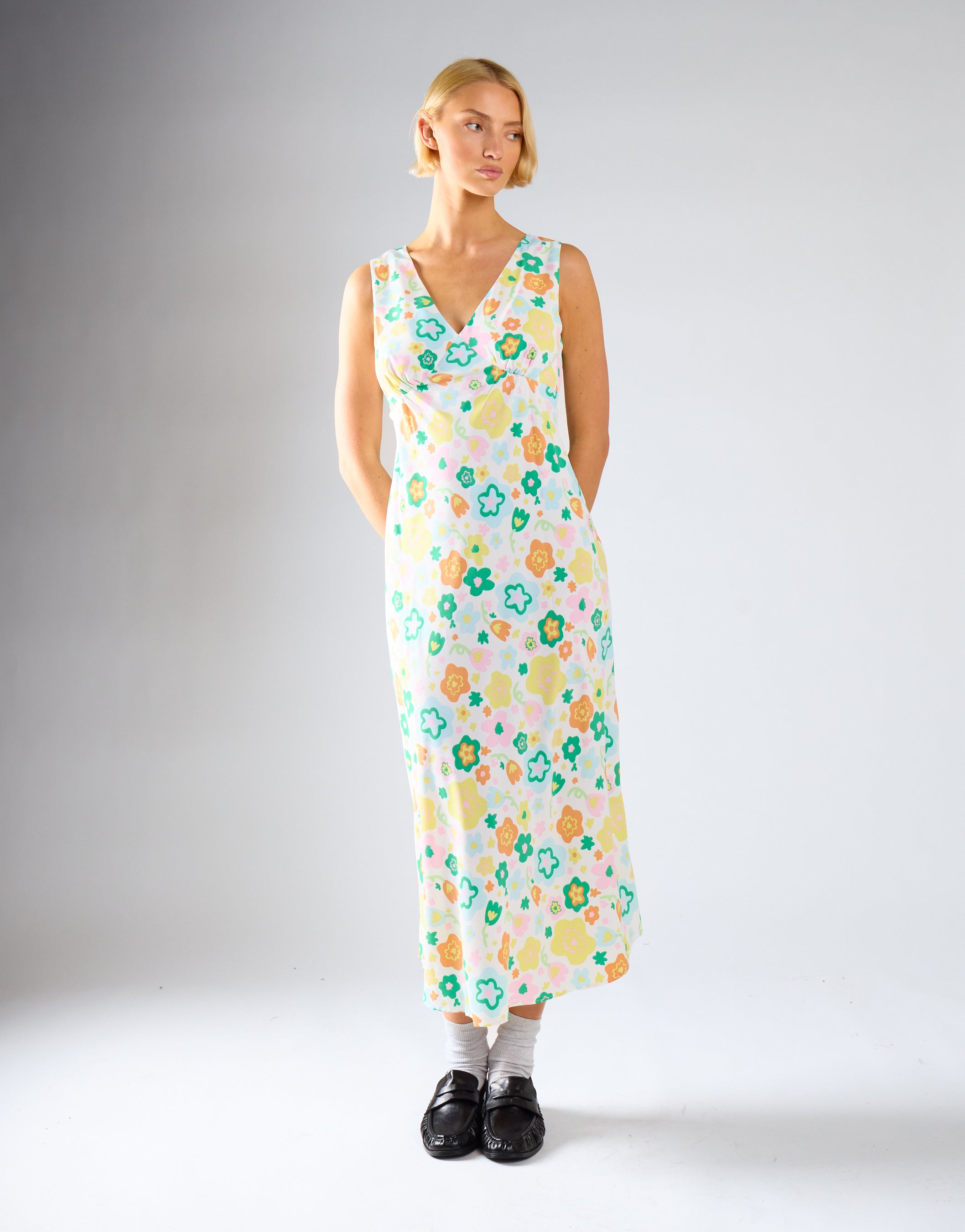 Retro Spring-Floral V-Neck Bias-Cut Maxi-Dress