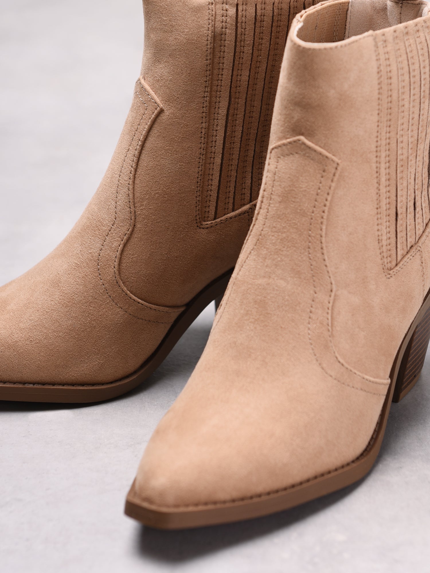 These Beige Suede Western Block Chunky Heel-Boots are not only stylish but also versatile. You can dress them up with a cute dress for a night out or pair them with jeans for a casual daytime look.