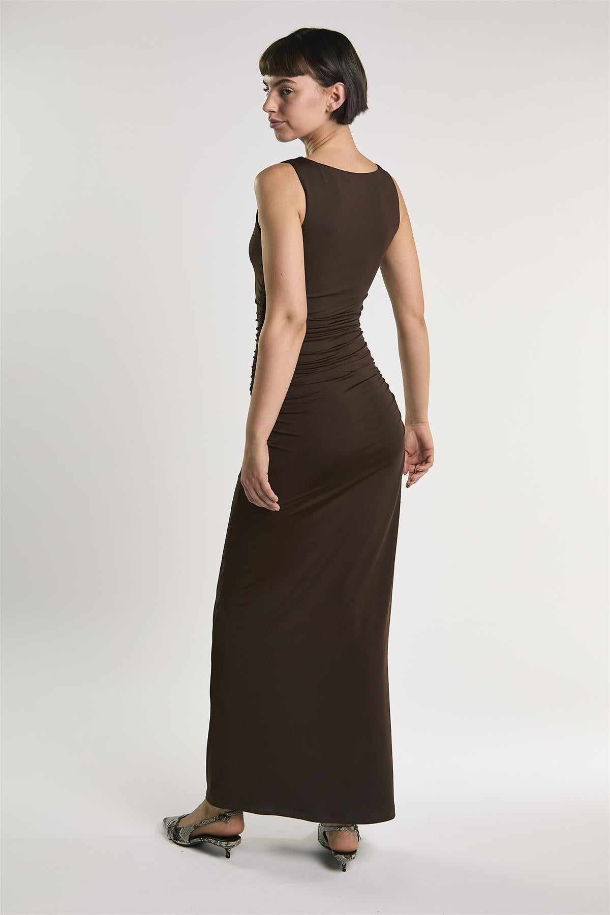 Glamorous Women's Bitter Chocolate Slash Neck Midaxi Dress. Confident, sleek, and effortlessly modern, this bitter chocolate slash neck midaxi dress brings timeless simplicity with a refined edge. The slash neckline frames the shoulders beautifully, while the sleeveless cut keeps the look streamlined and versatile. Designed in a slim fit, it follows the body’s natural lines for a flattering, sculpted shape that feels both comfortable and elegant. The midaxi length adds graceful balance, creating a silhouette that moves easily from relaxed days to polished evenings. Style with minimal heels and simple accessories for a clean, sophisticated look that never feels overdone.
