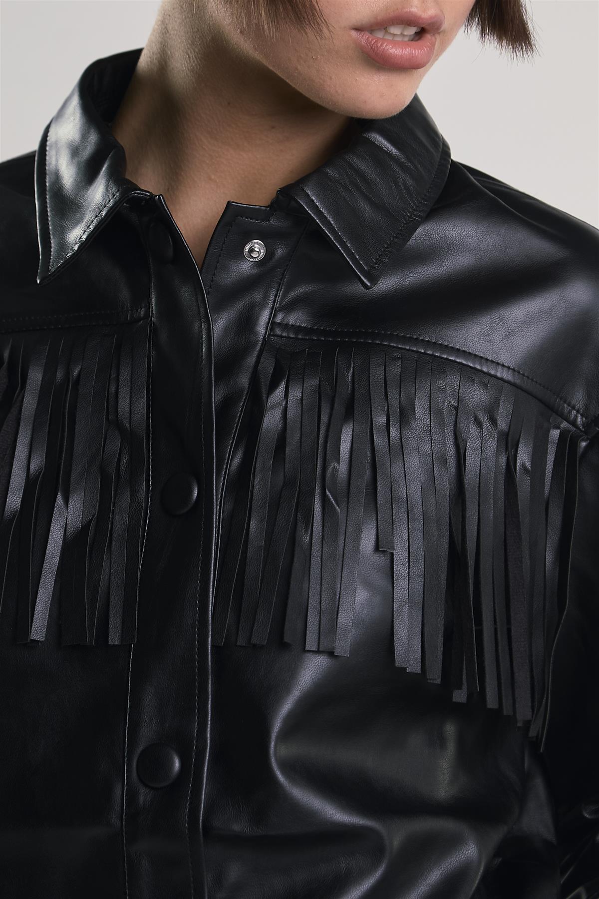 The Faux Leather Fringe Shirt delivers texture and movement with a playful edge. A button front and long sleeves keep the structure classic, while the soft faux leather brings a subtle sheen. Wear it solo as a statement piece or layer over a slim tee, it adapts seamlessly to your style.