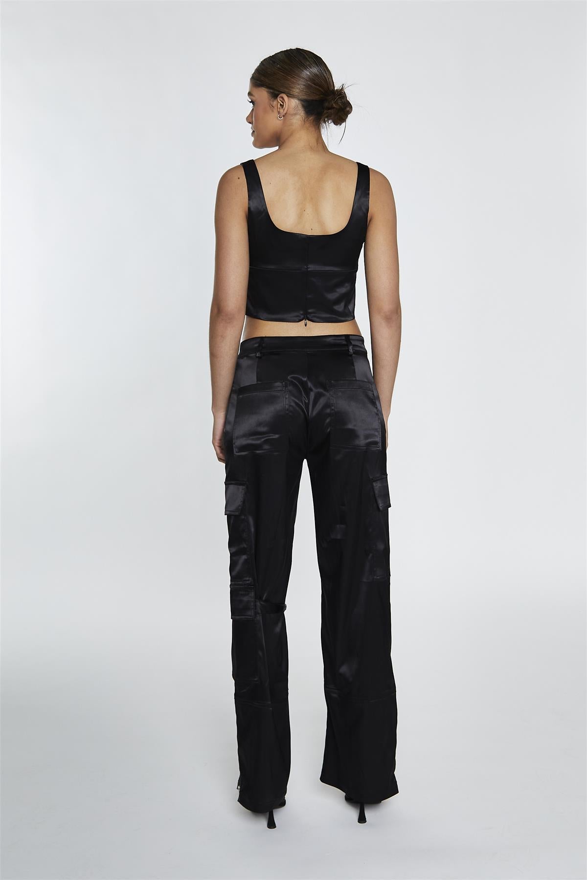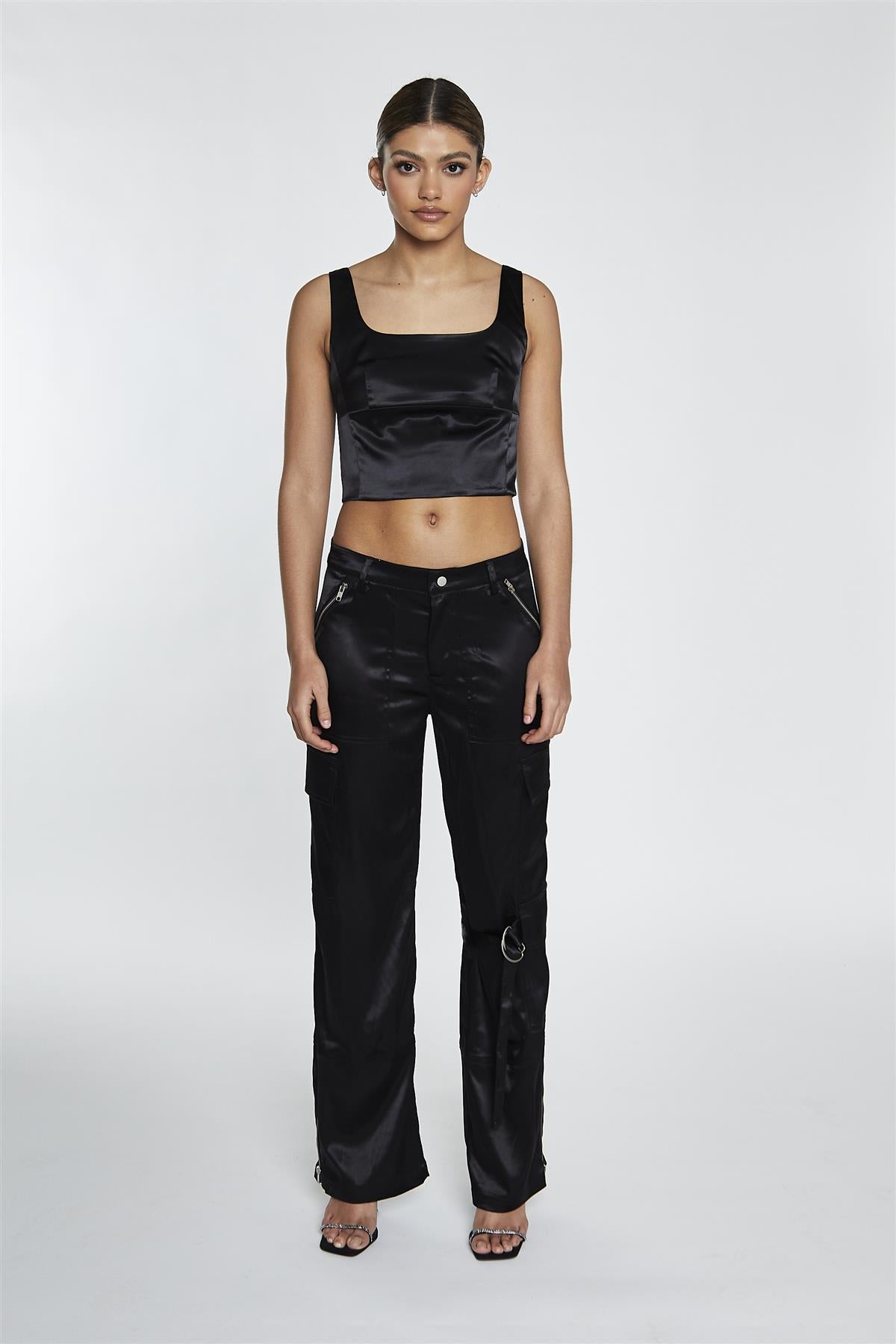 Glamorous Women's Black Satin D-Ring Detail Trousers. Sharp ease and quiet edge come together in these black satin D-ring detail trousers, giving you a relaxed, pulled-together look that feels confident without trying too hard. Button front adds a touch of structure at the waist, helping the trousers sit securely and comfortably so you feel supported through every movement, from sitting at a desk to walking across town. Zip detail brings a subtle, functional finish that keeps the closure smooth and reliable, making getting ready feel simple and fuss-free while adding a hint of modern attitude. D-ring feature introduces a utility-inspired touch that breaks up the satin surface with interest, drawing the eye and giving your outfit an instant lift without needing bold accessories. Style with a simple tee, a soft knit, or a tailored shirt to let the button front, zip detail, and D-ring accents quietly do the hard work of making your everyday look feel more polished, comfortable, and effortlessly cool.