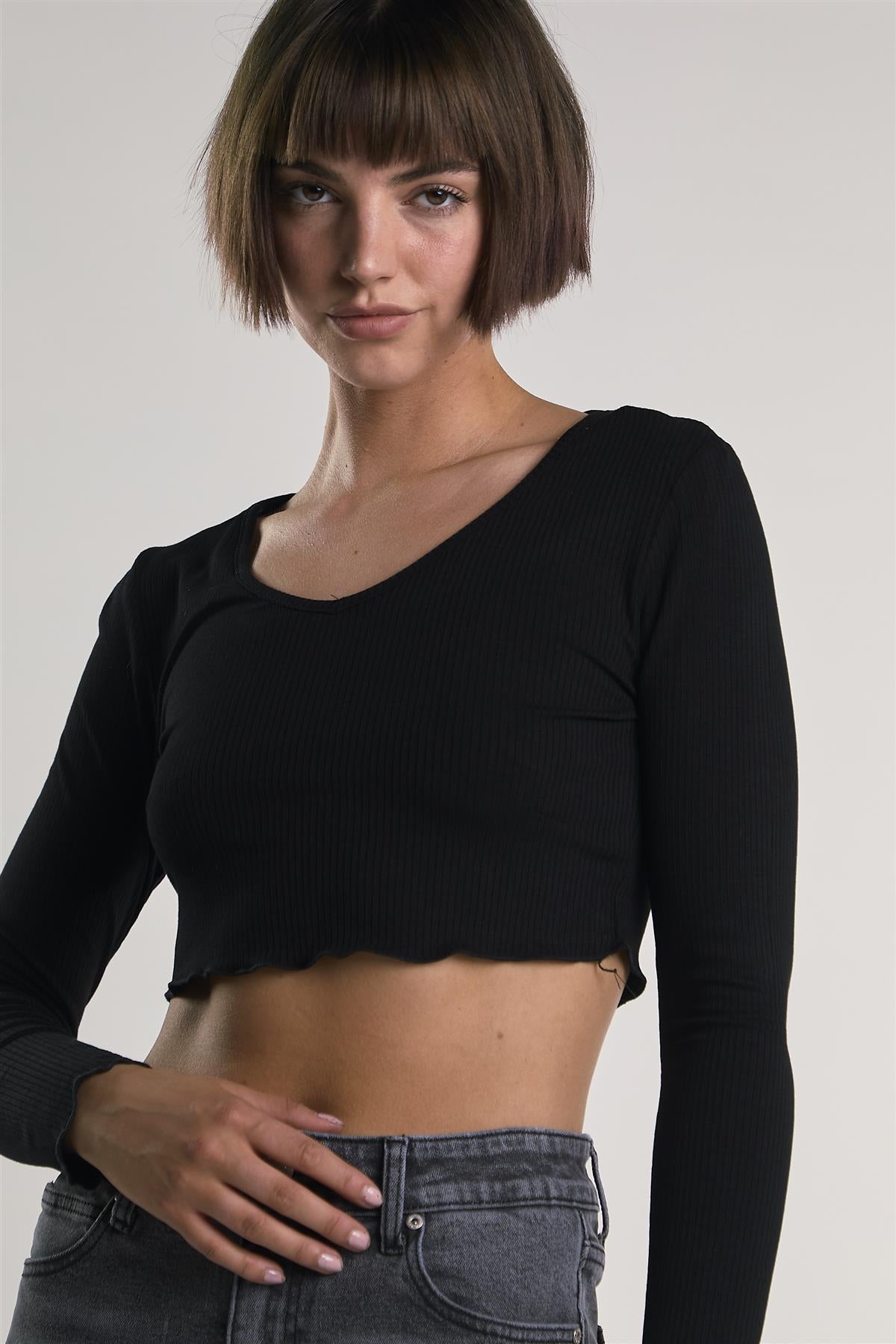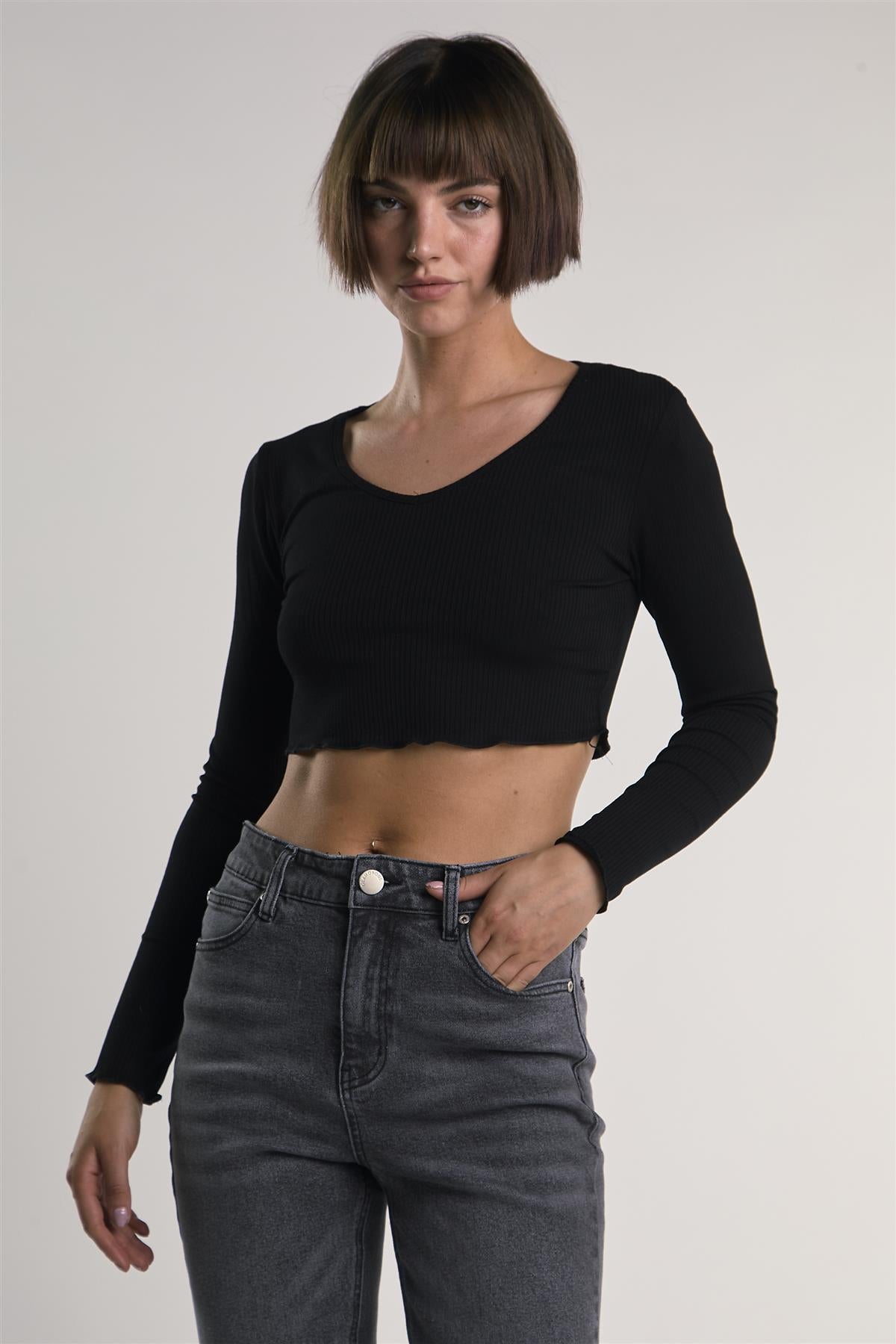 The V-Neck Lettuce Trim Long Sleeve Top brings a balance of comfort and style to everyday dressing. Cut from soft ribbed fabric, it offers a close, flexible fit that moves with you. Lettuce edging at the neckline and sleeves adds a subtle playful touch, while the cropped length makes it an easy match for high-waisted denim or layering pieces.