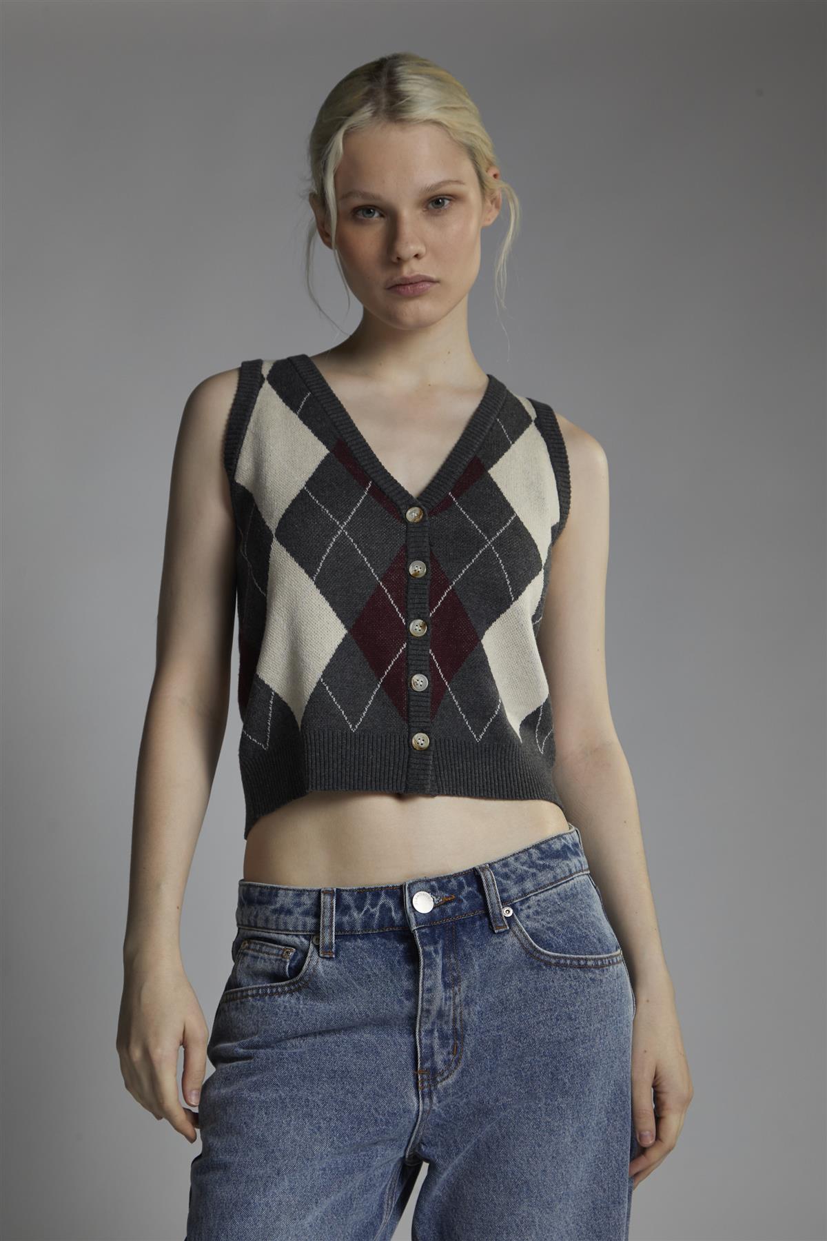 Narrated Women's Charcoal-Argyle Button-Front-Vest Crop-Top. This argyle button-front vest crop top brings a fresh take on a classic pattern, with a relaxed fit that still feels pulled together. The cropped length hits just right for pairing with high-waisted jeans, trousers, or even a matching skirt if you have one around. Sleeveless with a V-neck, it keeps things light and easy, while the button front adds a bit of structure without making it feel too formal. The soft knit texture gives it that worn-in comfort, making it something you’ll reach for more often than you think. Style it on its own or layer it over a fitted long sleeve when the weather cools—there’s room to make it yours.