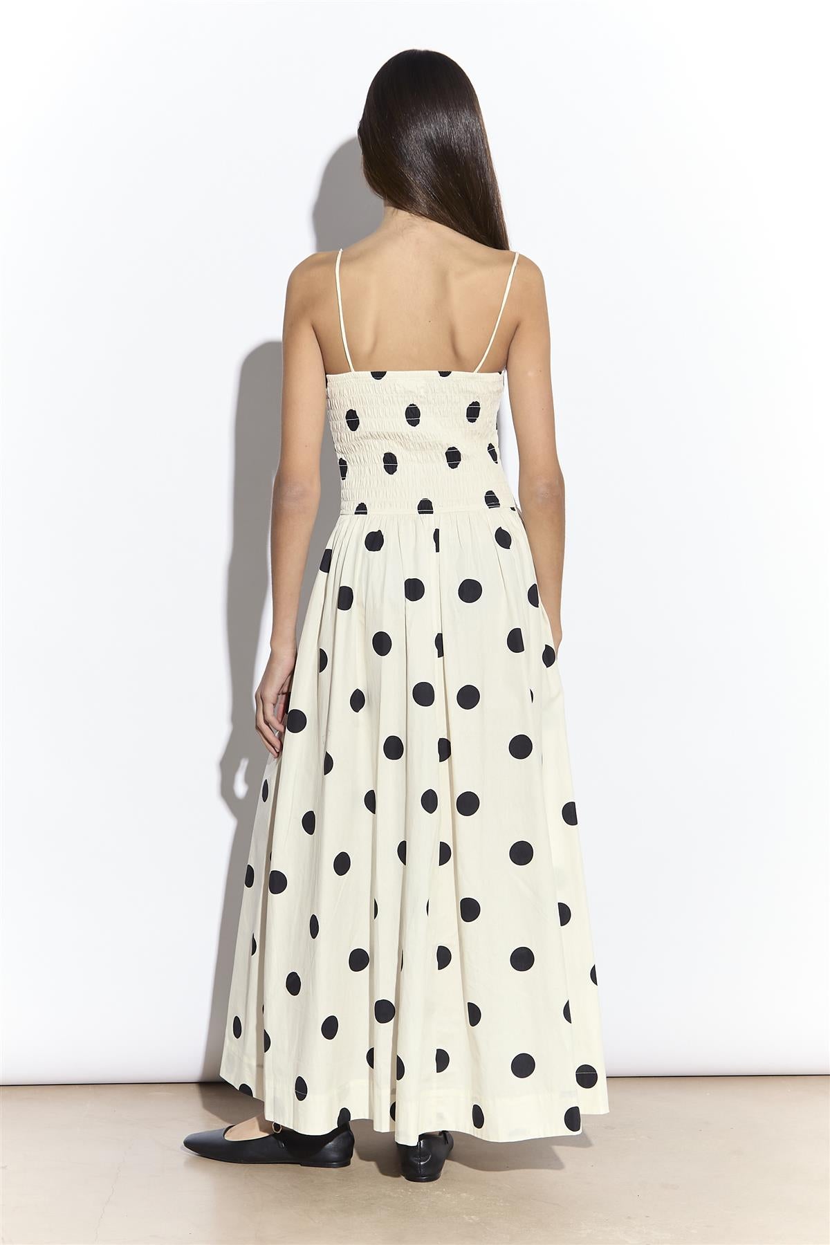 Narrated Women's Cream Spot Shirred Dropped Waist Midi Dress. Cream Spot. Soft shirring and subtle details come together beautifully in this midi dress, designed to flatter with ease and comfort. The elasticated smock bodice creates a gently fitted shape that moves effortlessly with you, while rouleau straps bring a delicate, feminine touch. Falling to a graceful midi length, the dropped waistline adds a relaxed feel that makes this style easy to wear and endlessly versatile. Whether dressed up or down, it offers a naturally elegant look that feels as good as it appears. Style with minimal jewellery and simple sandals for an understated finish.