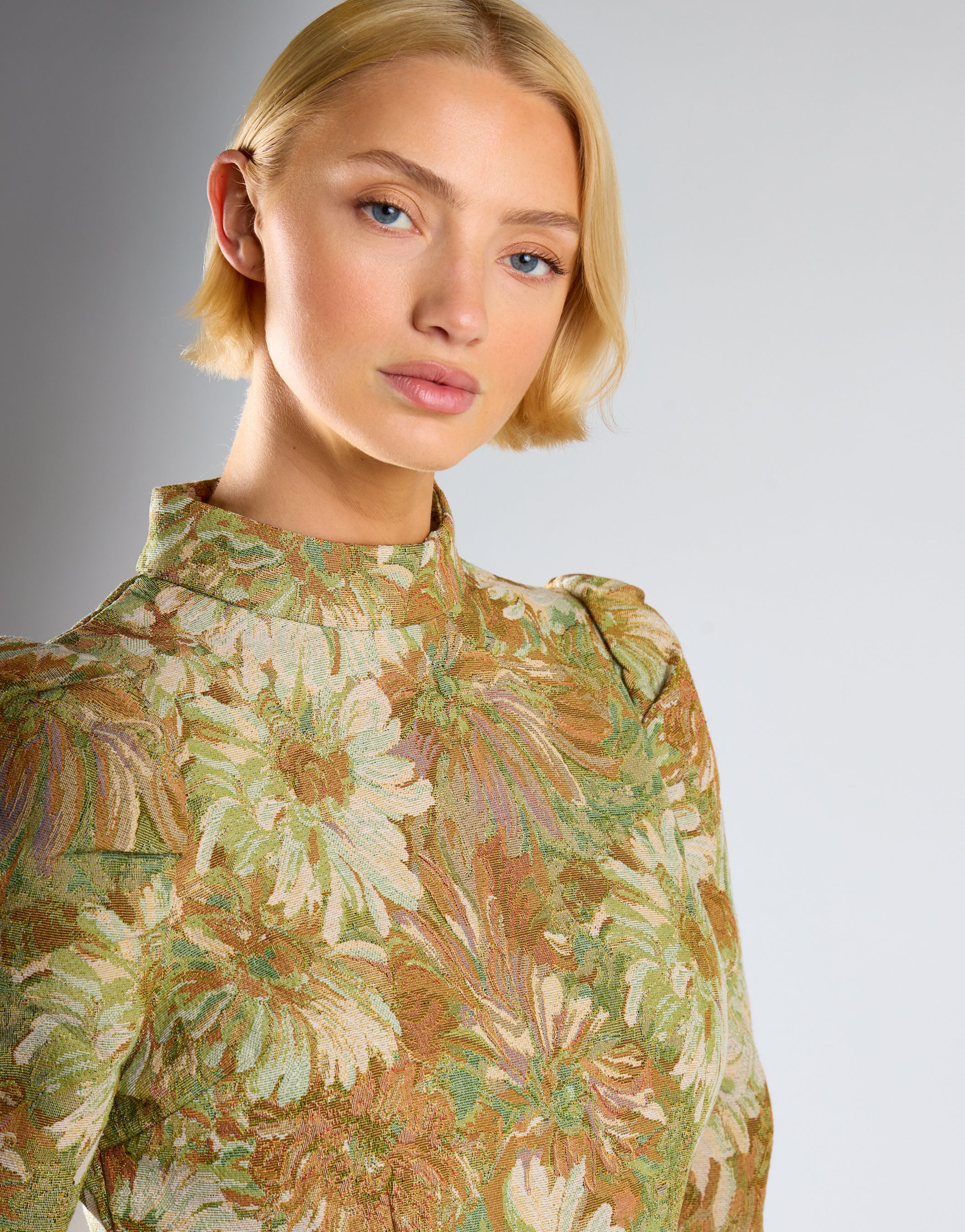 Glamorous Women's Green Multi Brocade High Neck Puff Sleeve Mini Dress. Opt for an on trend piece with this floral mini dress. This super flattering dress features high neck and puff shoulder style with floral detail. Style with strappy sandals for the daytimes and heels for the evening! We love this piece here at Glamorous!
