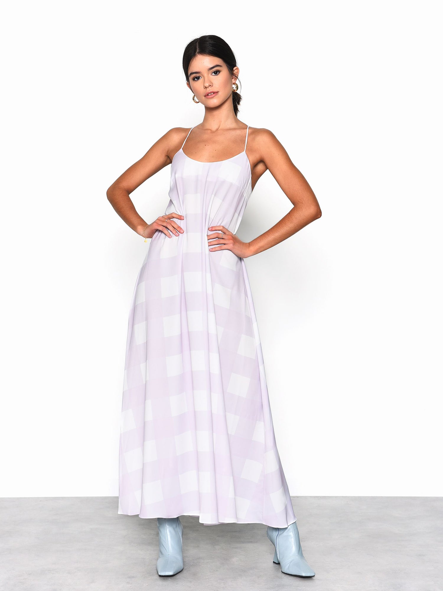 Glamorous Womens Lilac Checkerboard Print Midi Dress. This lilac checkerboard print dress in midi length is the must have staple piece this season. Featuring a check print all around and back strap detailing, this dress is super flattering addition to your closet!