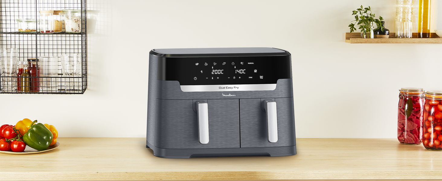 DES REPAS COMPLETS EN QUELQUES MINUTES: cuisinez deux ingrédients différents en même temps, pour un repas complet préparé dans un seul et même appareil grâce à cette double friteuse à air avec cuisson synchronisée LA PLUS GRANDE DUAL AIR FRYER DU MARCHE: capacité XXL (11L) avec un tiroir de 6.5L pour les pièces volumineuses comme un rôti de 2kg et un tiroir de 4.5L pour les accompagnements comme des frites, idéale pour 6 à 10personnes POLYVALENCE MAXIMALE: 7programmes prédéfinis (frites, poulet, légumes, poisson, desserts, déshydratation et contrôle manuel de la température de 40 à 200°C, pour des résultats parfaits à chaque fois PLATS ÉQUILIBRÉS: frites croustillantes ou saumon parfaitement grillé, préparez une multitude de plats savoureux et équilibrés qui plairont à tout le monde RÉPARABILITÉ 15ANS AU JUSTE PRIX: engagement de réparabilité 15ans au juste prix grâce à notre réseau de 6200réparateurs dans le monde, pour contribuer à la protection de l’environnement et à la réduction des déchets GAIN DE TEMPS ET D'ÉNERGIE: consomme jusqu'à 70% moins d'énergie et cuit jusqu'à plus 40% plus rapidement qu'un four traditionnel (tests effectués en 2024 avec des frites surgelées) NETTOYAGE FACILE: le panier de cuisson antiadhésif et compatible lave-vaisselle pour un nettoyage sans effort APPLICATION MY MOULINEX: avec l'application My Moulinex, découvrez des idées de recettes en fonction de vos goûts, du temps ou des ingrédients que vous avez, créez votre liste de course, planifiez vos repas et bien plus CONTENU: Dual Easy Fry XXL, 2grilles amovibles Afficher plus › Voir plus de détails DES REPAS COMPLETS EN QUELQUES MINUTES: cuisinez deux ingrédients différents en même temps, pour un repas complet préparé dans un seul et même appareil grâce à cette double friteuse à air avec cuisson synchronisée LA PLUS GRANDE DUAL AIR FRYER DU MARCHE: capacité XXL (11L) avec un tiroir de 6.5L pour les pièces volumineuses comme un rôti de 2kg et un tiroir de 4.5L pour les accompagnements comme des frites, idéale pour 6 à 10personnes POLYVALENCE MAXIMALE: 7programmes prédéfinis (frites, poulet, légumes, poisson, desserts, déshydratation et contrôle manuel de la température de 40 à 200°C, pour des résultats parfaits à chaque fois PLATS ÉQUILIBRÉS: frites croustillantes ou saumon parfaitement grillé, préparez une multitude de plats savoureux et équilibrés qui plairont à tout le monde RÉPARABILITÉ 15ANS AU JUSTE PRIX: engagement de réparabilité 15ans au juste prix grâce à notre réseau de 6200réparateurs dans le monde, pour contribuer à la protection de l’environnement et à la réduction des déchets GAIN DE TEMPS ET D'ÉNERGIE: consomme jusqu'à 70% moins d'énergie et cuit jusqu'à plus 40% plus rapidement qu'un four traditionnel (tests effectués en 2024 avec des frites surgelées) NETTOYAGE FACILE: le panier de cuisson antiadhésif et compatible lave-vaisselle pour un nettoyage sans effort APPLICATION MY MOULINEX: avec l'application My Moulinex, découvrez des idées de recettes en fonction de vos goûts, du temps ou des ingrédients que vous avez, créez votre liste de course, planifiez vos repas et bien plus CONTENU: Dual Easy Fry XXL, 2grilles amovibles Afficher plus › Voir plus de détails