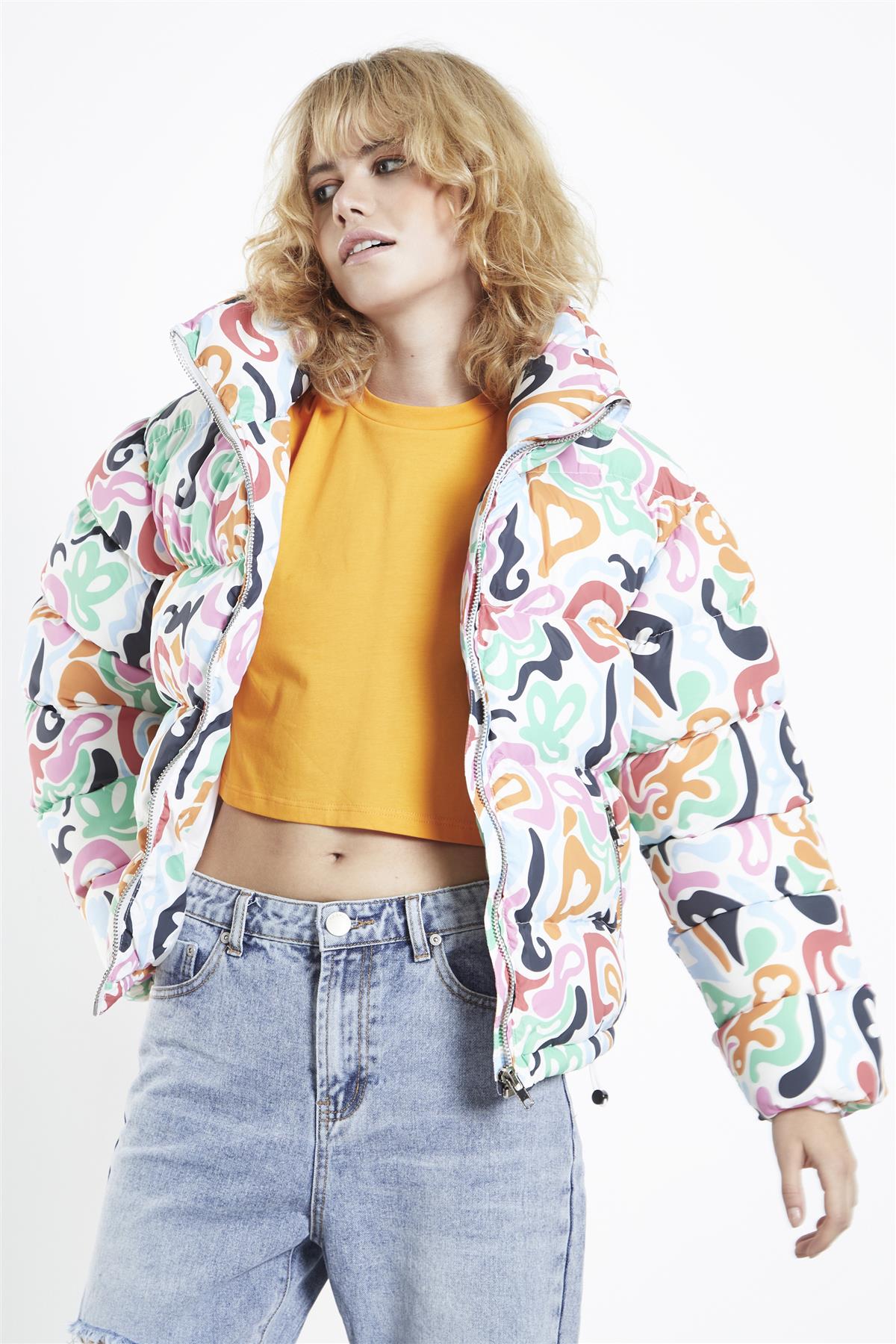 Glamorous Women's Multi Abstract Print Puffer Jacket. Cozy confidence and light layering wrap you up gently in this multi abstract print puffer jacket, bringing a relaxed, insulating boost that keeps you comfortable through long days without bulk or hassle. Cropped fit hits right at the hips, creating a balanced silhouette that flatters your frame and layers seamlessly over tops or dresses for an instant style lift that feels supportive and non-restrictive. Puff material fills softly with airy warmth, trapping heat efficiently while staying lightweight and breathable, so you move freely without overheating or feeling weighed down. Zip fastening glides smoothly up the front for secure, adjustable closure that’s easy to use one-handed, keeping everything in place during busy moments. Style with a ruched crop top, V-neck blouse, or mini dress to let the cropped fit, puff material, and zip detail quietly add that protective, effortlessly cool edge to your look.