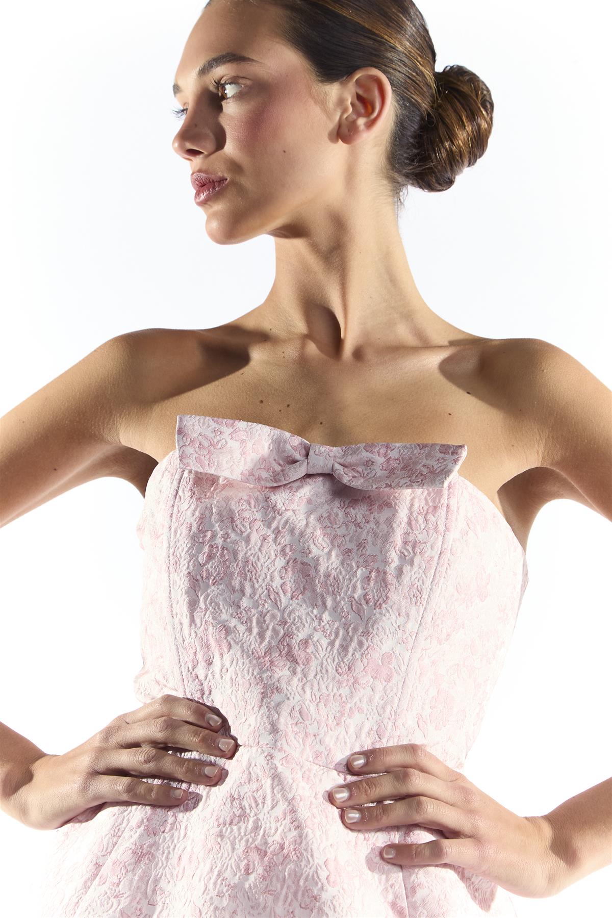 Collective the Label Women's Pink Floral Brocade Bandeau Mini Dress. Step into playful elegance with this strapless bandeau mini dress, designed to make every movement feel effortless and confident. The ball gown silhouette adds a sense of drama and structure, while the multi-layered lining ensures a smooth, voluminous shape that holds beautifully. Falling to a mini length, it strikes the perfect balance between flirty charm and sophisticated style. Strapless for a clean, flattering neckline, this dress highlights the shoulders and creates a striking, polished silhouette. Style with minimal accessories and sleek heels for a naturally chic, standout look that feels both fun and refined.