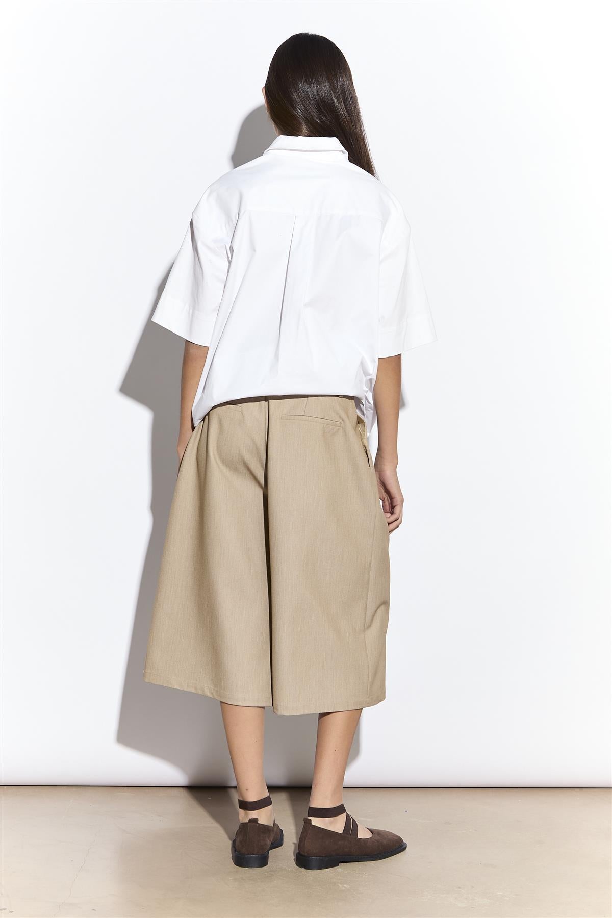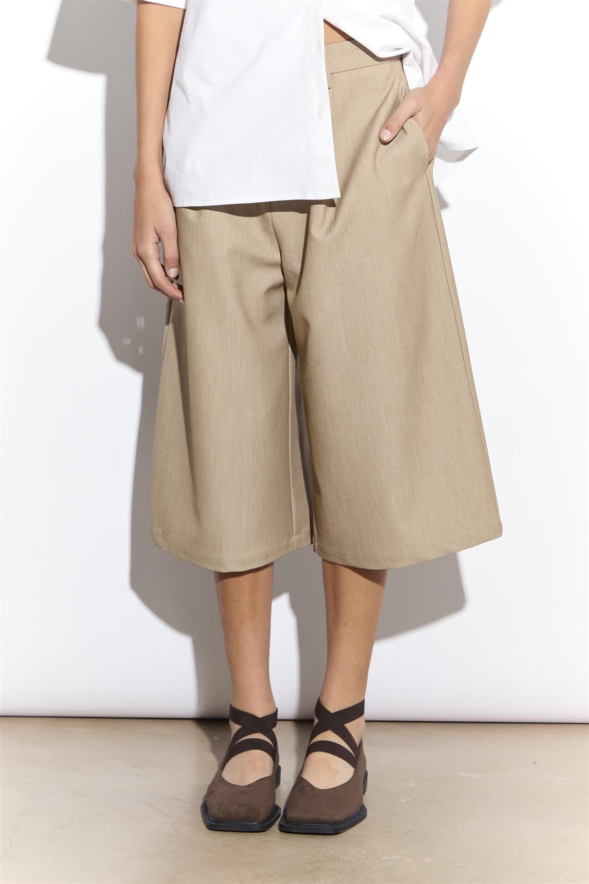 Narrated Women's Tailored Long Shorts In Sand Colour. Bring a polished, modern edge to your wardrobe with these tailored long shorts in sand, designed to balance comfort and sophistication effortlessly. The fixed waistband with belt loops ensures a secure, flattering fit while allowing you to accessorize with ease, and the fall-below-knee length creates a streamlined, versatile silhouette that works for both smart and casual occasions. With a contemporary feel, these shorts elevate everyday dressing without compromising ease of movement. Style with structured tops or tucked-in blouses for a chic, put-together look that feels modern and confident from morning to evening.