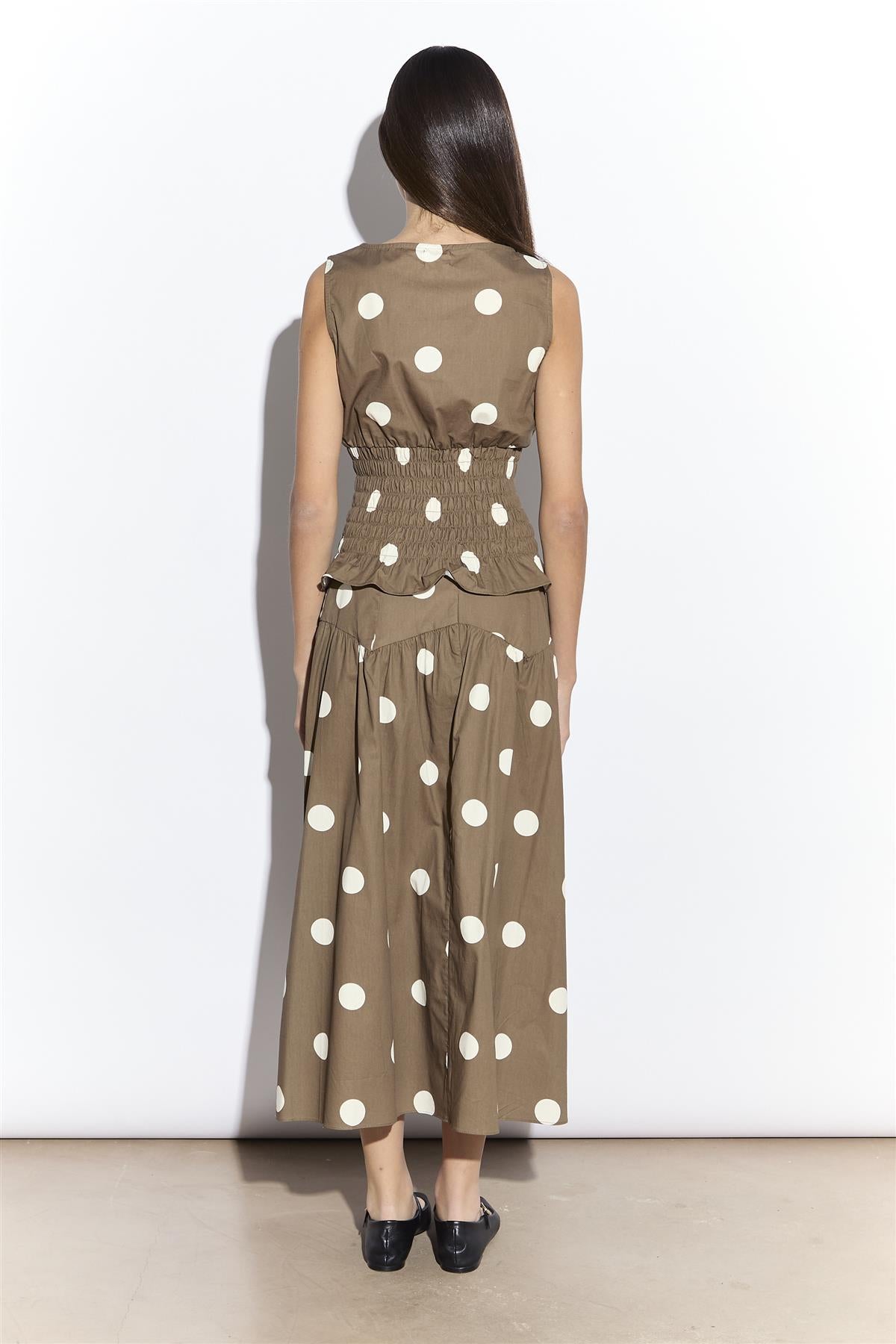 Narrated Women's Taupe White Spot Dropped Waist Midi Skirt. Flowing movement and effortless elegance come together in this dropped waist midi skirt, designed to create a look that feels both relaxed and refined. The dropped waist adds a modern twist, gently elongating the silhouette, while the midi length brings a sense of balance and grace. Soft gathers through the full skirt offer subtle volume and natural flow, giving it an easy, flattering drape with every step. Its timeless spot pattern adds character without overpowering your style. Style with the matching sleeveless shirred top for a coordinated, polished outfit that feels thoughtfully put together.