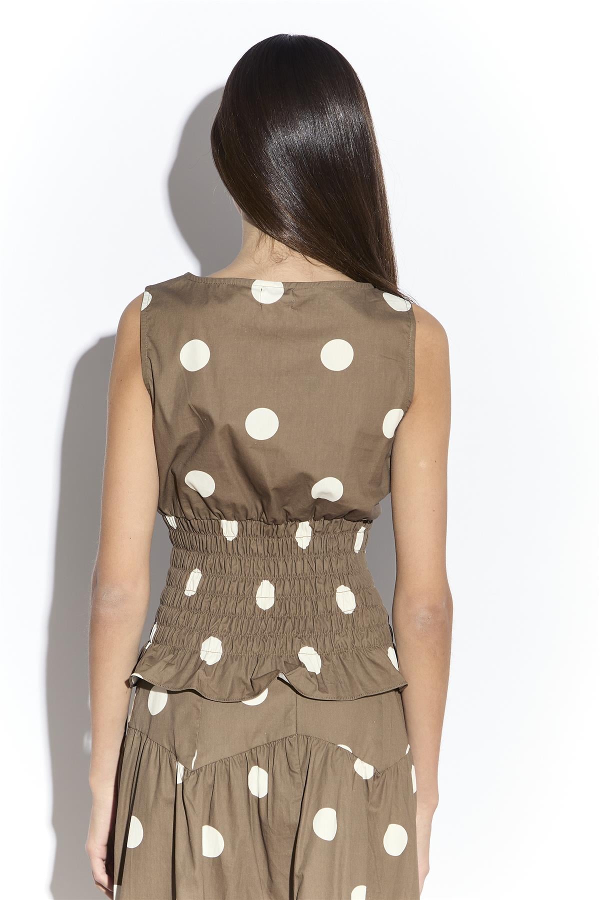 Narrated Women's Taupe White Spot Sleeveless Shirred Top. Easy charm meets everyday comfort in this sleeveless shirred top, designed to bring effortless shape and style to your look. The boat neck adds a graceful touch, while the sleeveless design keeps the silhouette clean and versatile. A softly shirred waist creates gentle definition, giving a flattering fit that moves comfortably with you. Its timeless spot pattern adds a playful edge that pairs beautifully with tailored pieces or laid-back separates. Style with matching trousers or skirts for a coordinated finish that feels relaxed yet refined, perfect for elevating simple everyday dressing.
