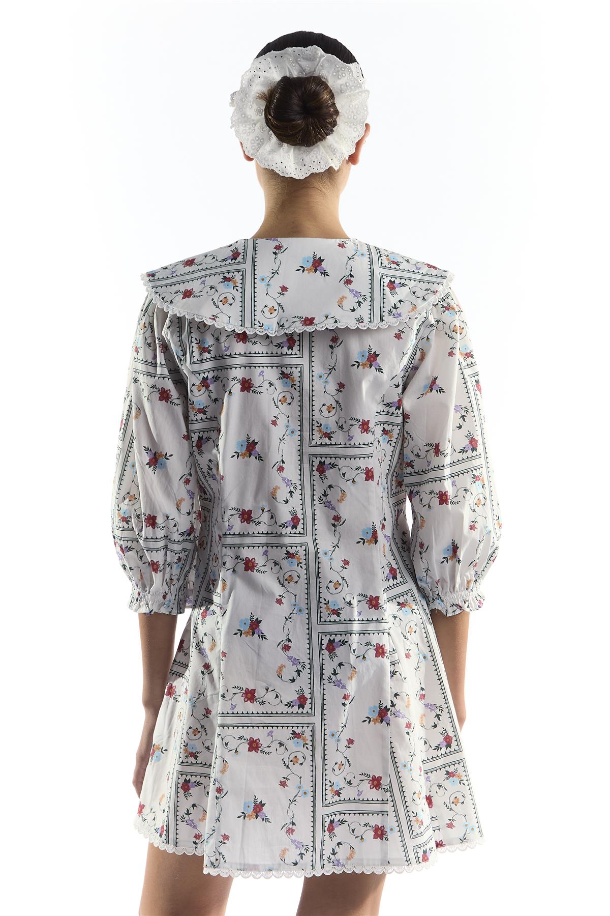 Collective the Label Women's White Picnic Print Mini Dress. Add a touch of charm to your everyday style with this White Picnic Print Mini Dress, crafted to bring comfort and personality to your look. Designed with 3/4 sleeves for easy wear, it offers a balanced, flattering shape that feels effortless. The button front adds a practical and versatile touch, while the lace trim at the edge of the collar gives a delicate, detailed finish. Volume sleeves with gathers create a soft, feminine silhouette, complemented by rouleau ties at the front for a hint of playful detail. Style with your favourite accessories to complete a look that feels relaxed yet refined.