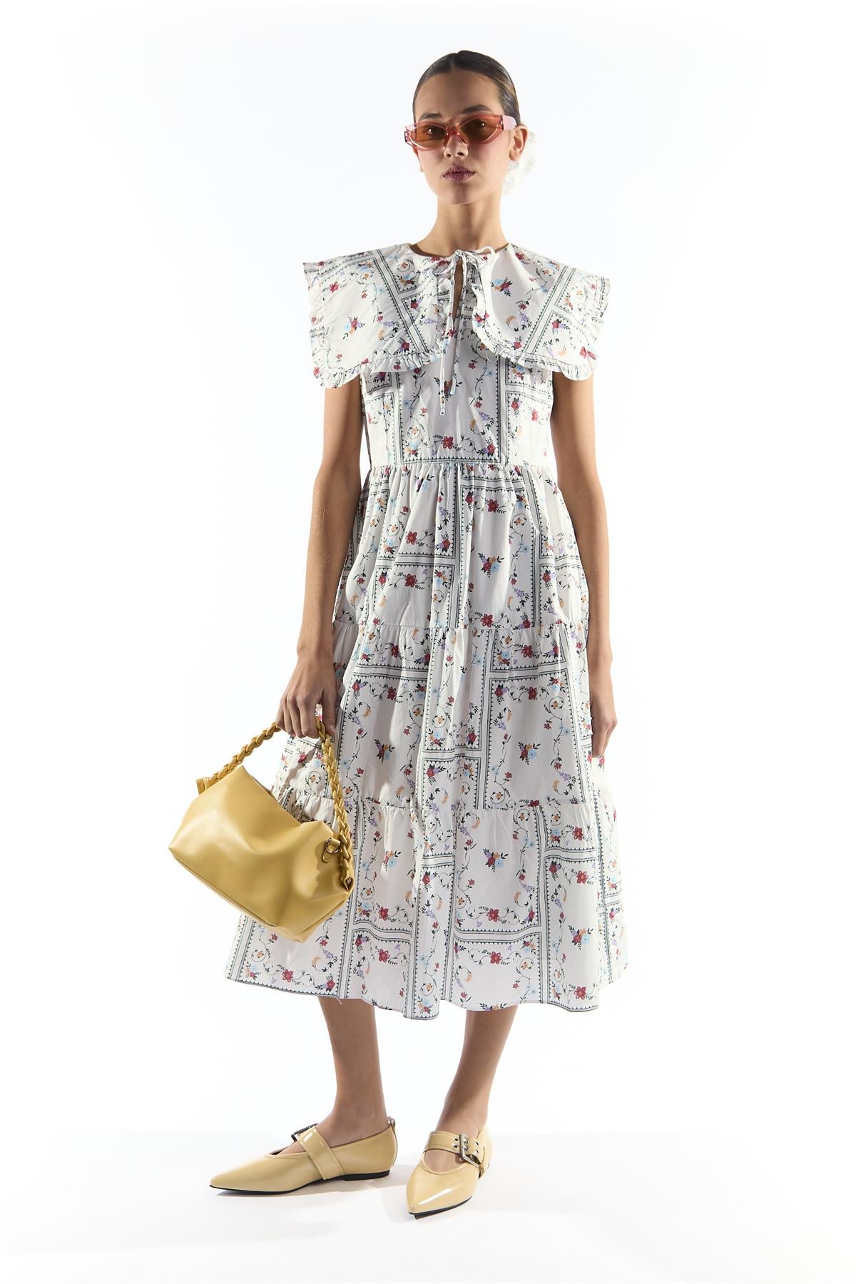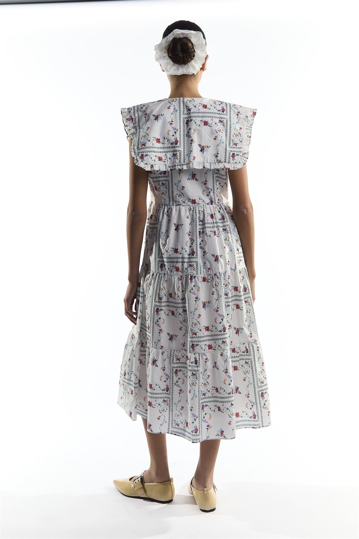 Collective the Label Women's White Picnic Print Oversized Collar Tiered Midi Dress. Embrace an easy sense of style with this White Picnic Print Tiered Midi Dress, designed to bring comfort and confidence to your look. The sleeveless design keeps the fit relaxed and versatile, while the oversized ruffle collar adds a playful, standout detail that elevates the silhouette. Falling to a flattering midi length, the tiered skirt creates gentle movement and flow, giving the dress a soft, feminine shape that feels effortless to wear. Style with your favourite accessories to complete a look that blends charm, comfort, and everyday elegance in one beautifully simple piece.